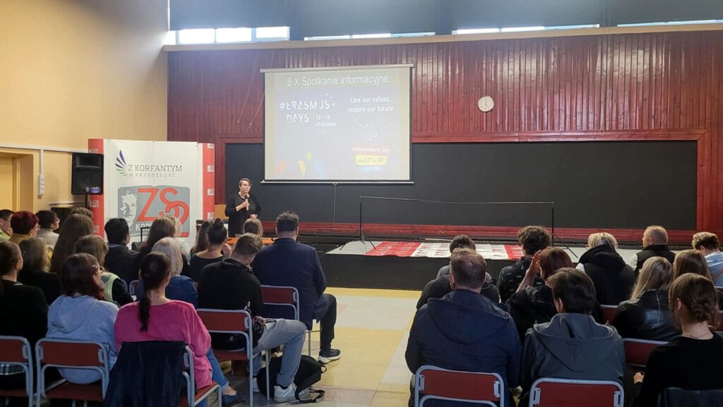 Uczniowie klas drugich i trzecich Technikum oraz drugiej A Szkoły Branżowej wzięli udział w spotkaniu informacyjnym na temat możliwości odbycia zagranicznych staży zawodowych w ramach Akredytacji Erasmus+ realizowanej w Korfantym.